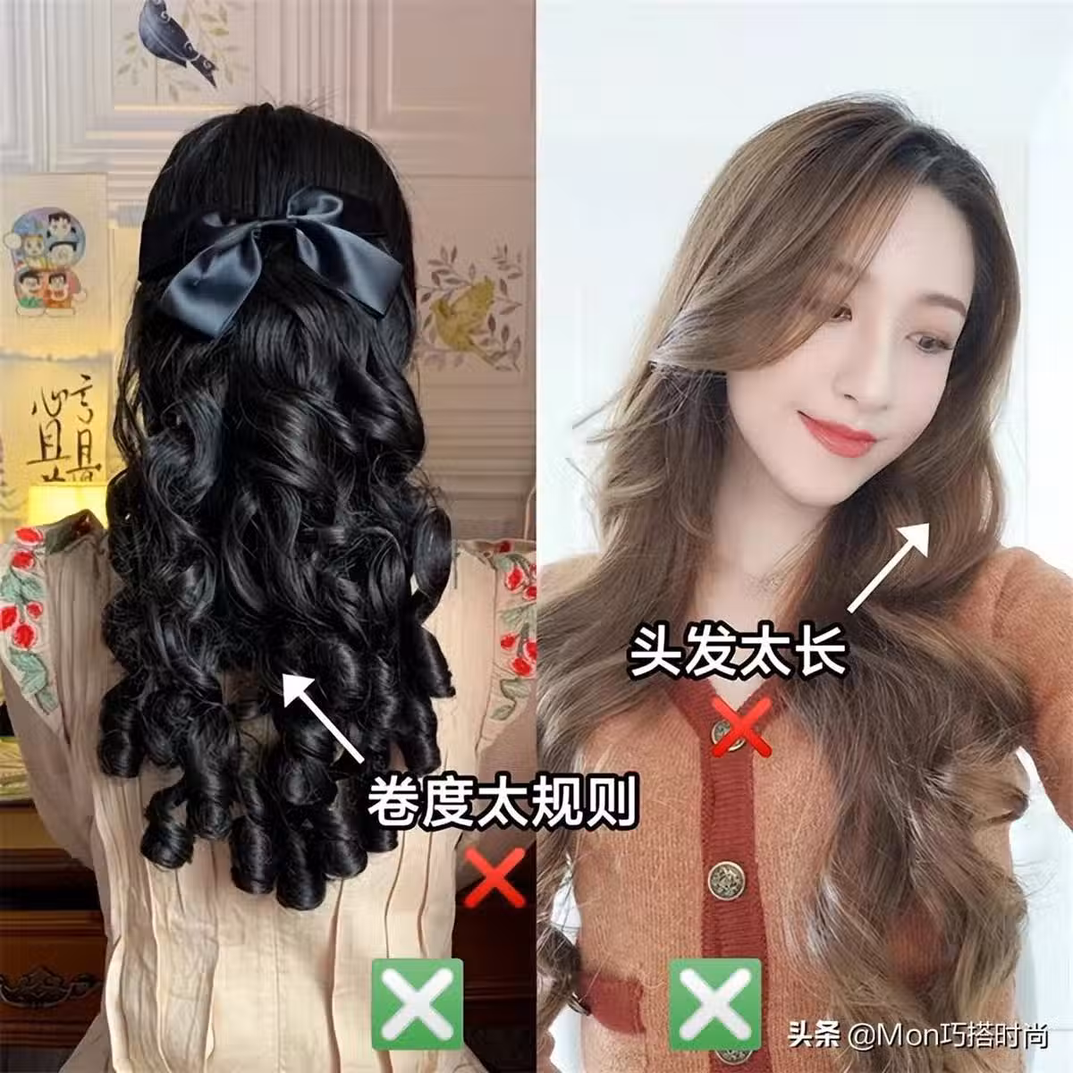 大卷比小卷更容易駕馭,但同樣也別選卷度過於規則的大卷發,要是頭髮過胸,那就更別選弧度規則的大卷了,立刻就能讓你從時髦女郎變成「村姑」!