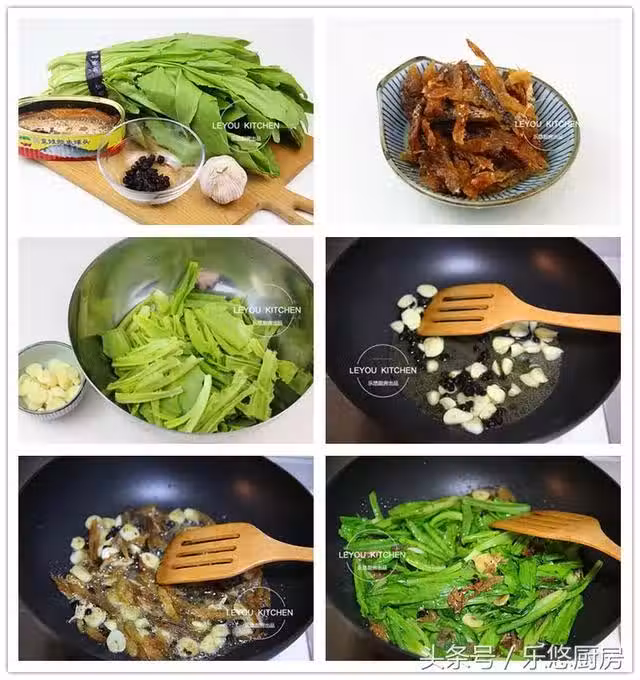 第六步:將油麥菜放入鍋中煸炒勻均,再放入半勺白糖調味,待麥菜變軟即可出鍋。(一定要用大火炒,不然油麥菜容易出湯。另外,因為豆豉和魚罐頭都有鹽味,所以,不用再放鹽。還有,加一點糖可以提鮮。)