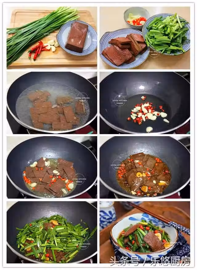 韭菜比較易熟,大火快炒即可。另外,鹽不要放得太早,快出鍋時放就可以了。放太早,容易讓韭菜出湯。