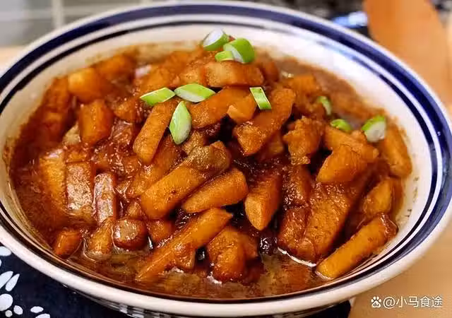 2.起鍋燒油,下入五花肉煸炒出油,加入兩個八角,干辣椒花椒,蔥薑末,炒出香味,下入土豆條炒勻,調入鹽、醬油、十三香、雞精、味精,翻炒均勻,翻炒上色,加入適量開水,大火燒開,轉中小火燒至入味、土豆粉糯,再轉大火收濃湯汁,出鍋裝盤,撒蔥花點綴即可。