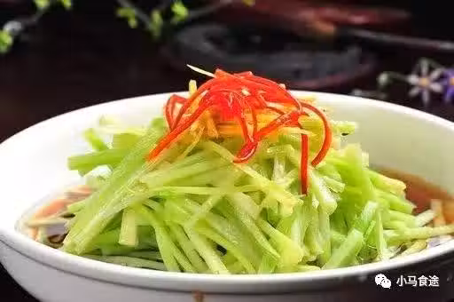 1.芹菜洗凈,切成絲,入沸水焯熟,瀝去水分,放盤中。