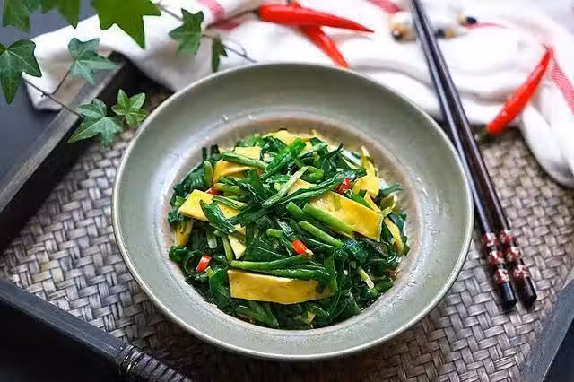 【食材】韭菜160克、雞蛋3個、紅辣椒3個、鹽適量、澱粉少許【做法】1、將雞蛋液磕入碗中攪拌均勻,韭菜切段2、放入1勺澱粉水,加澱粉水可以增加雞蛋皮的柔嫩口感3、電餅鐺預熱,擦上少許油,倒入蛋液攤成蛋餅,再將雞蛋餅切成條後切段4、鍋預熱注入油,放入紅辣椒炸幾秒鐘,倒入韭菜炒半分鐘5、放入雞蛋皮和鹽快速翻炒半分鐘即可關火出鍋西紅柿炒雞蛋