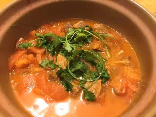 鍋內加水,沒過食材,老丁用的砂鍋,也可以用高壓鍋,或者就是炒鍋。加入鹽調味,如果酸度不夠,可以加入番茄醬。燒開後小火慢燉一個小時,然後加入大塊西紅柿,再燉半小時至牛肉軟爛為止。