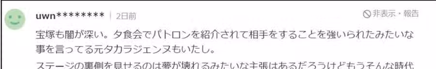 寶塚也很黑暗的。之前就有寶間奴說在晚宴上被強行介紹贊助商讓她當人家戀人的。