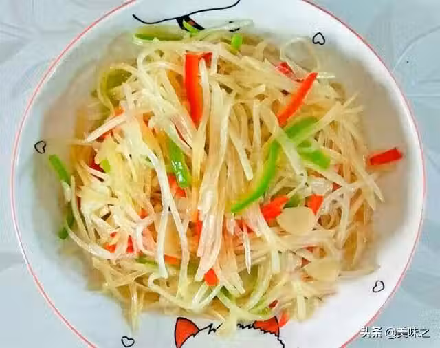 大土豆1個、青椒1個、紅椒半個、蒜半頭、花椒粒少許、油少許、白糖少許、香醋少許、醬油少許、香油少許。