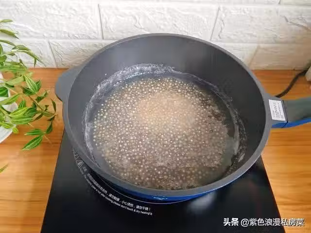 3.西米放入以後,要用鍋鏟攪拌一下,以免粘鍋,大火燒開後,蓋上鍋蓋中小火再煮15分鐘,待西米只有中間一點白色的就關火,燜5分鐘。