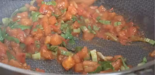 西紅柿炒出汁水之後把我們切好的小青菜倒入鍋中一起翻炒。