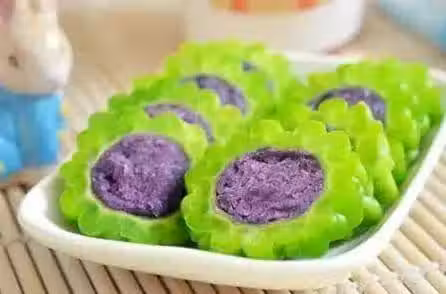 6、很漂亮的一盤苦瓜紫薯吧,味道是先苦後甜,這個夏天你可以試著做一下哦