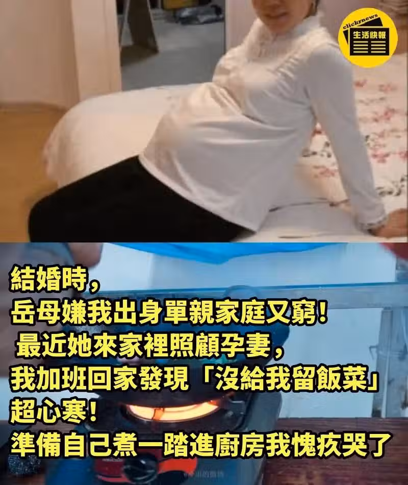 結婚時,岳母嫌我出身單親家庭又窮!! 最近她來家裡照顧孕妻,我加班回家發現「沒給我留飯菜」超心寒!準備自己煮「一踏進廚房我愧疚哭了」