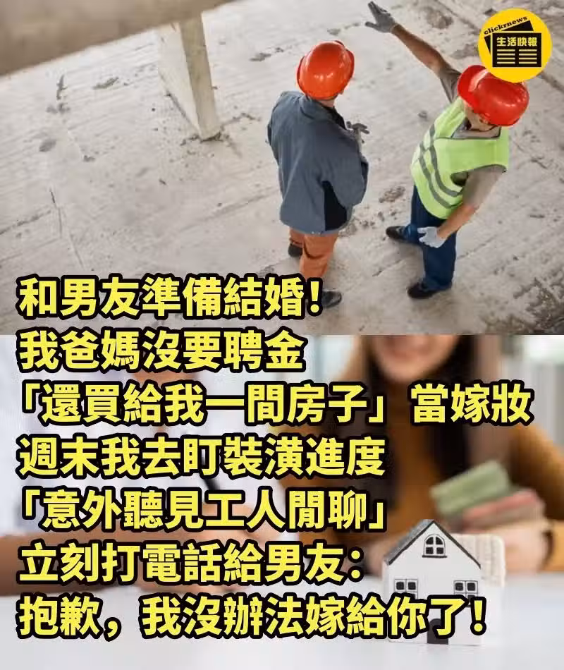 和男友準備結婚! 我爸媽沒要聘金「還買給我一間房子」當嫁妝,周末我去盯裝潢進度「意外聽見工人閒聊」立刻打電話給男友:抱歉,我沒辦法嫁給你了