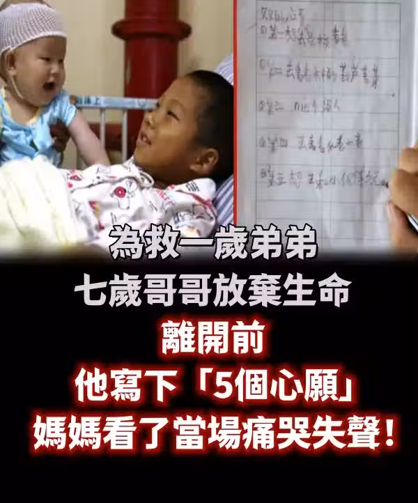 為救一歲弟弟,七歲哥哥放棄生命,離開前他寫下「5個心愿」,媽媽看了當場痛哭失聲!