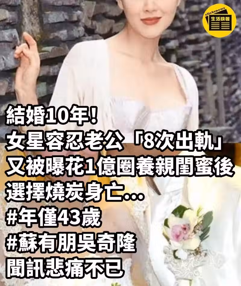 結婚10年!女星容忍老公「8次出軌」 又被曝「花1億圈養親閨蜜後」選擇燒炭身亡... #年僅43歲#蘇有朋吳奇隆聞訊悲痛不已