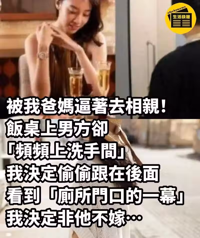 被我爸媽逼著去相親!飯桌上男方卻「頻頻上洗手間」,我決定偷偷跟在後面,看到「廁所門口的一幕」,我決定非他不嫁…