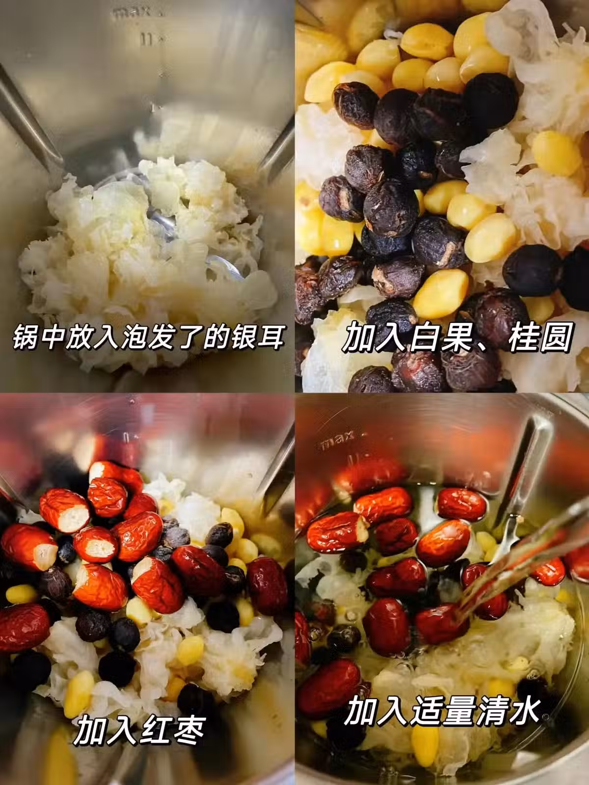 白果去殼、去芯,白果+桂圓+紅棗倒入鍋中;