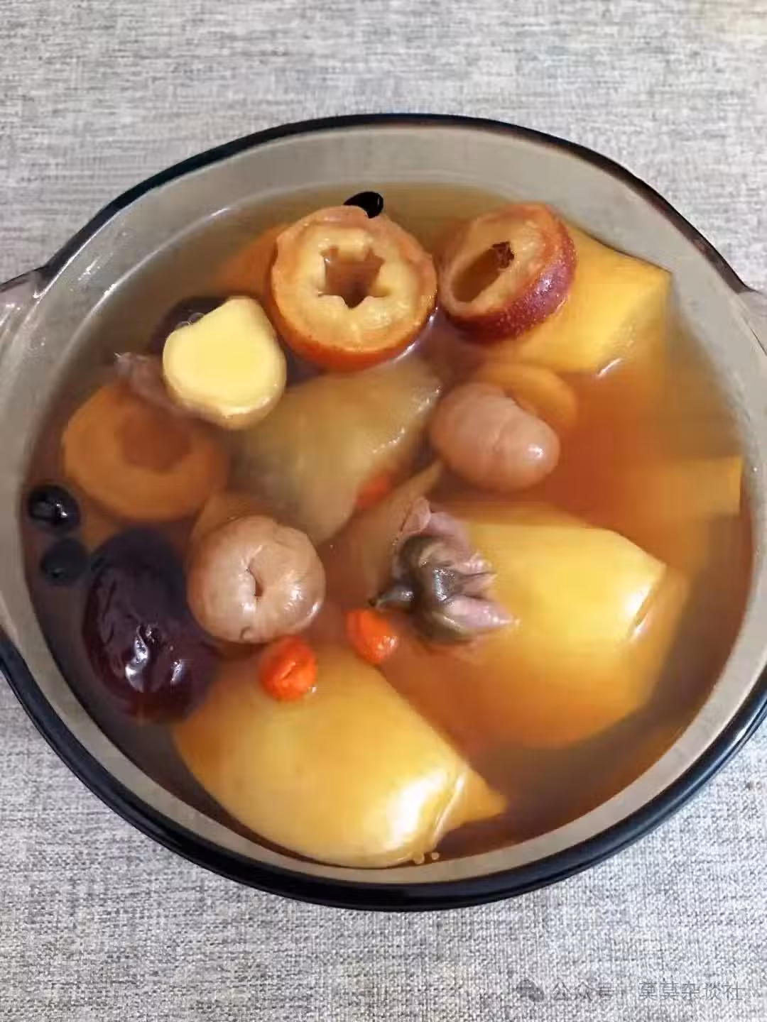 食材: 蘋果半個 | 桂圓3顆 | 薑片3片 | 紅棗3顆 | 山楂干5片 | 紅糖10克 | 玫瑰花5朵