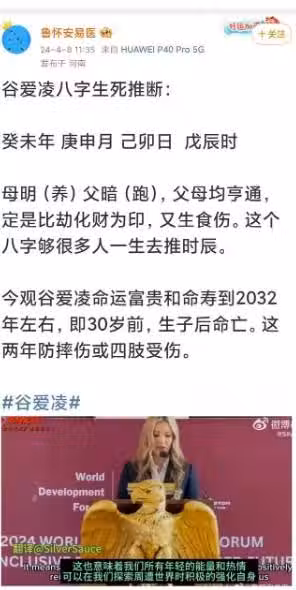 除了大S,「魯懷安易醫」也曾為谷愛凌、趙露思、凱特王妃等人進行八字推算, 例如預言谷愛凌 30 歲左右要防止摔傷或四肢受傷,凱特王妃則不會有性命之憂。這些預言的準確性引發了網友們的好奇和討論,也讓「魯懷安易醫」的微博關注度暴增。