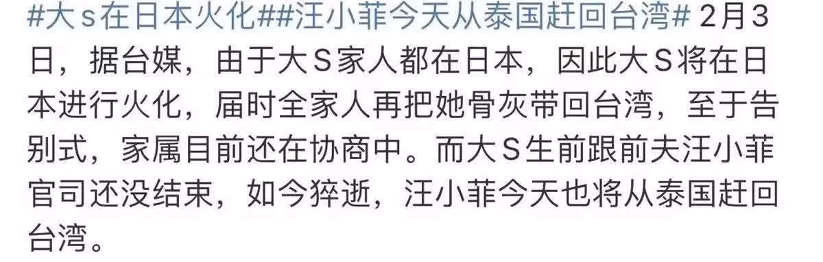 大S今天在日本火化,火化後家裡人把帶著她的骨灰回家,屆時再辦追悼會下葬。