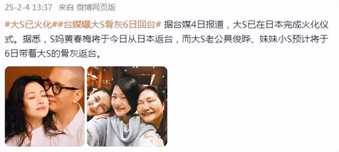 2月4日,據台媒報道,藝人大S已在日本完成火化儀式。從前一天大S離世消息被證實到現在,仍然不敢相信她是真的離開了。誰能想到,去的時候還是好好的一個人,現在竟然變成了「骨灰」,想想都覺得好難過。媒體還表示S媽黃春梅將於今日從日本返台,處理女兒的相關後事,而大S的老公具俊曄和妹妹小S目前仍然在日本,據悉,他們預計將於6日帶著大S的骨灰返台。
