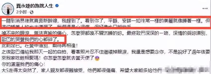 聽聞噩耗後,她便直接奔赴其所在的醫院,看到其臨終的模樣,就像是往常一樣睡著了一樣:這位睡美人你也太瀟洒了,我們還是心很痛,但好像也只能放手。