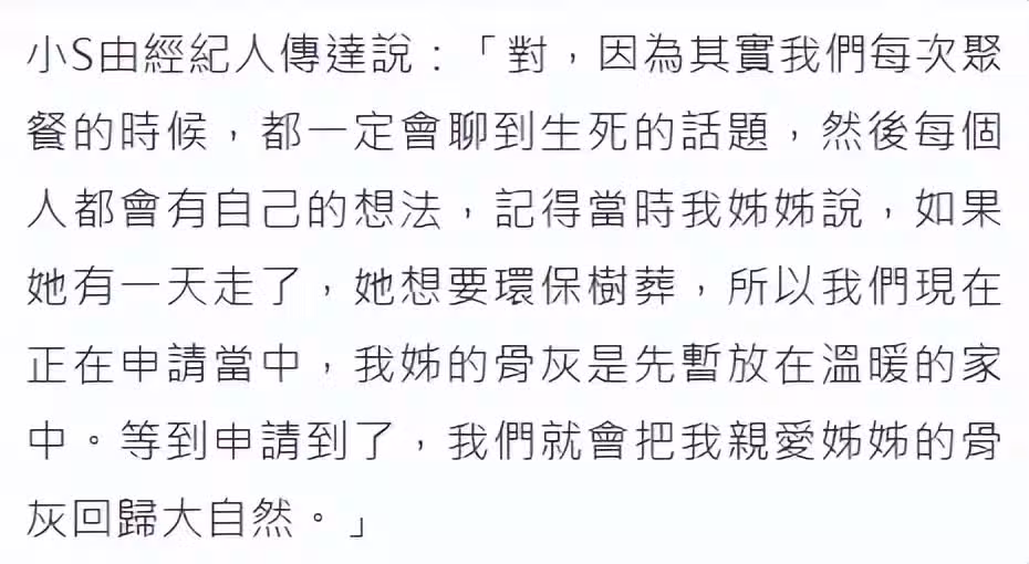 對於大S的後事,小S於2月7日深夜通過經紀人透露,大S生前說過如果有一天走了,想要環保樹葬,家人遵從大S的心愿正在申請當中,骨灰只是暫放家中,等申請到了,會把大S的骨灰回歸大自然。