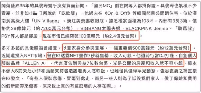 台媒吹噓,除了擁有房產,具俊曄還多才多藝,根本不是吃軟飯的人,人家賣一幅畫就能賺500萬韓元(2.5萬人民幣),還會打碟還有自己服裝品牌,代言費都是7位數台幣起步,台媒表示,這還是具俊曄已經公開的資產和收入,這要是沒公開,那就更多了。