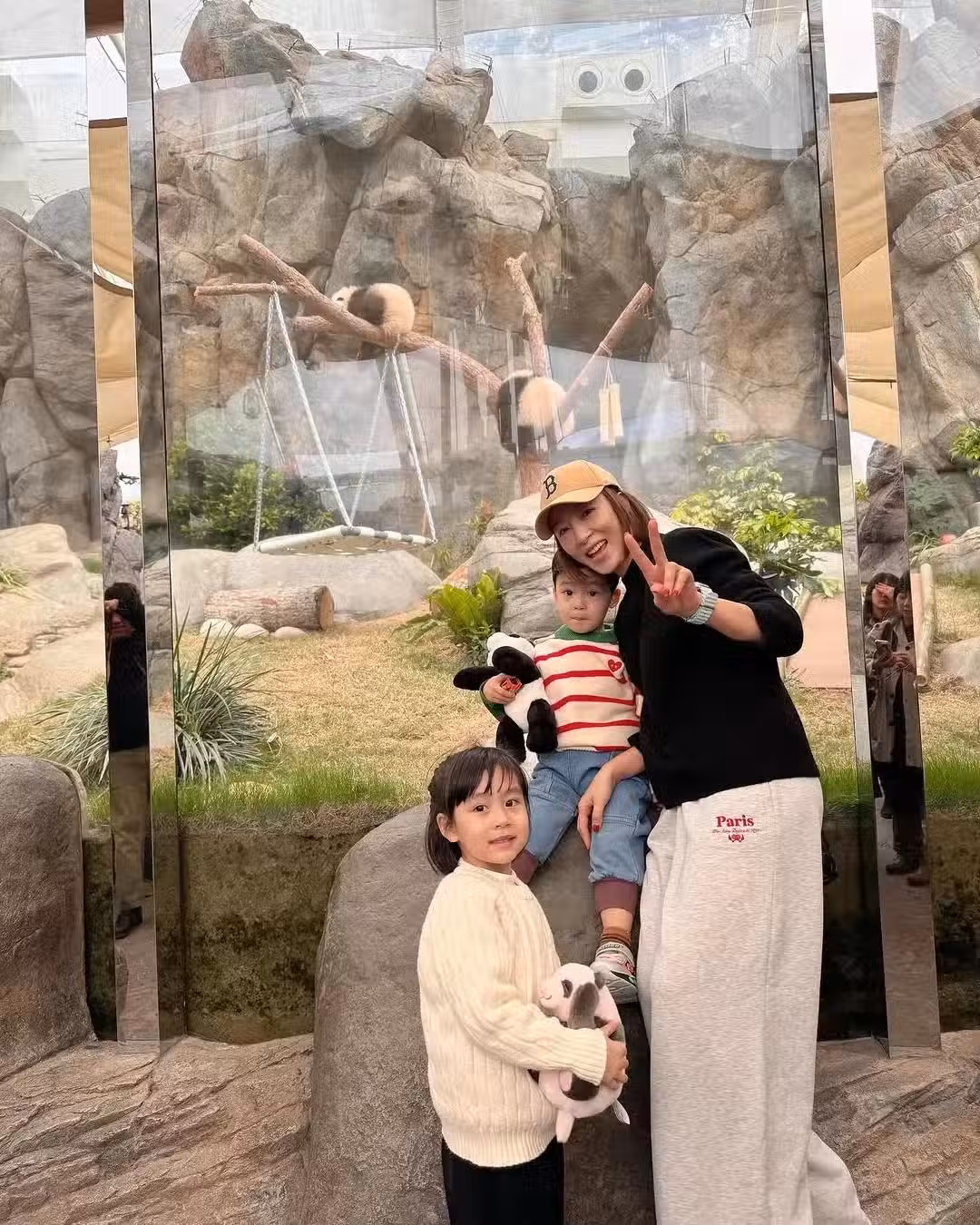 照片中,楊怡頭戴棒球帽,身穿黑色毛衣搭配灰色衛褲,一身休閒裝看起來高挑苗條,很顯年輕活力。女兒小珍珠身穿白色毛衣和黑色長褲,打扮漂亮可愛,十分養眼。兒子Eden身穿紅白條紋上衣和牛仔褲,帥氣可愛,小正太范十足。楊怡對著鏡頭比剪刀手,兒子抱著熊貓玩偶坐在石頭上,女兒抱著熊貓玩偶站在前面,一家三口面帶笑容,好開心。