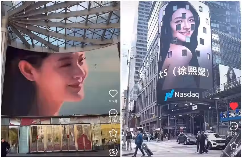 除了祈福燈之外,近日在南京吾悅廣場的電視牆上,播放著大S生前的在螢光幕上的點點滴滴,也有粉絲特別在美國紐約時代廣場買下廣告來紀念大S。