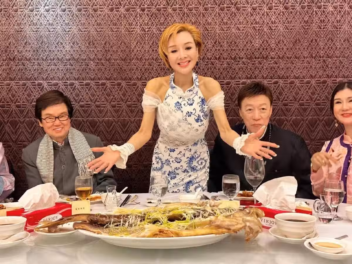 58歲葉子楣請明星朋友吃大餐,穿著青花瓷裙子,整個人瘦到顯病態