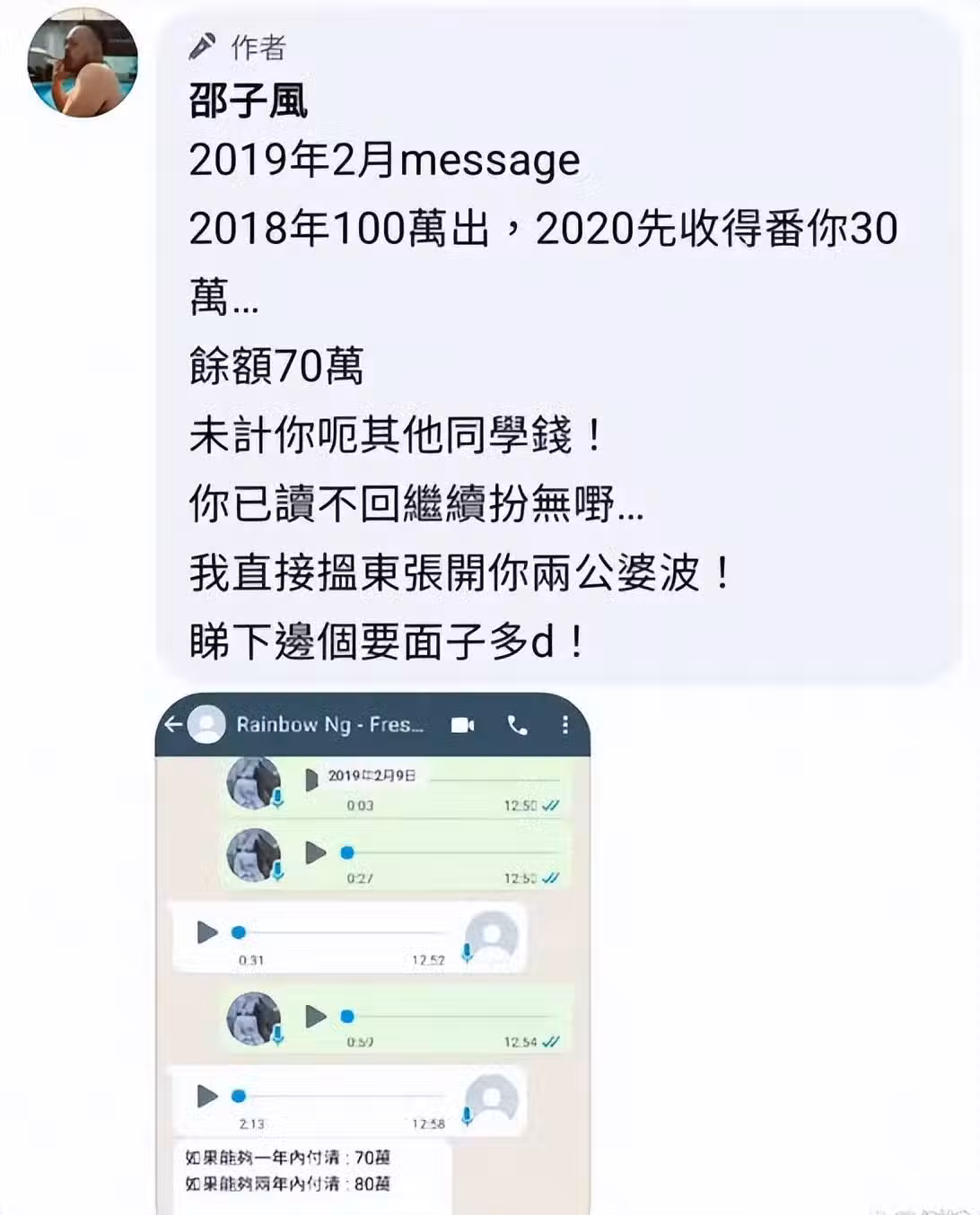 邵子風何許人也,他曾與藝人楊詩敏相戀,職業發展更是多元化。邵子風曾在社交平台上發文「歌手呂方的太太伍慧寶小姐,見字請主動聯繫我,否則我交專人處理」。
