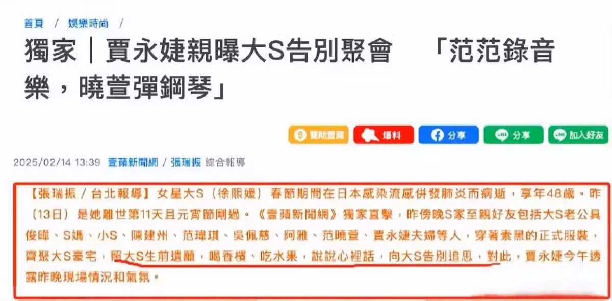 就比如在大S的告別會結束之後,賈永婕接受採訪直接透露了現場的情況。