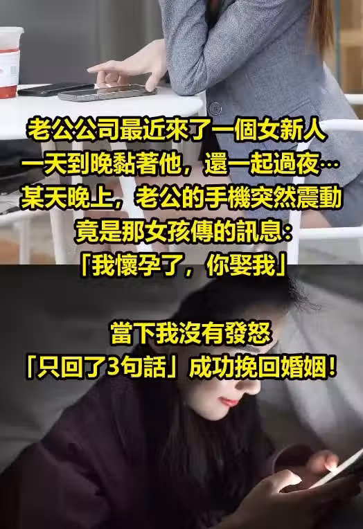 老公公司近期來了一個新女人,一天到晚黏著他,還一起過夜⋯某天晚上,老公的手機突然震動,竟是那女孩傳的訊息:「我懷孕了,你娶我」。當下我沒有發怒「只回了3句話」,成功挽回婚姻!