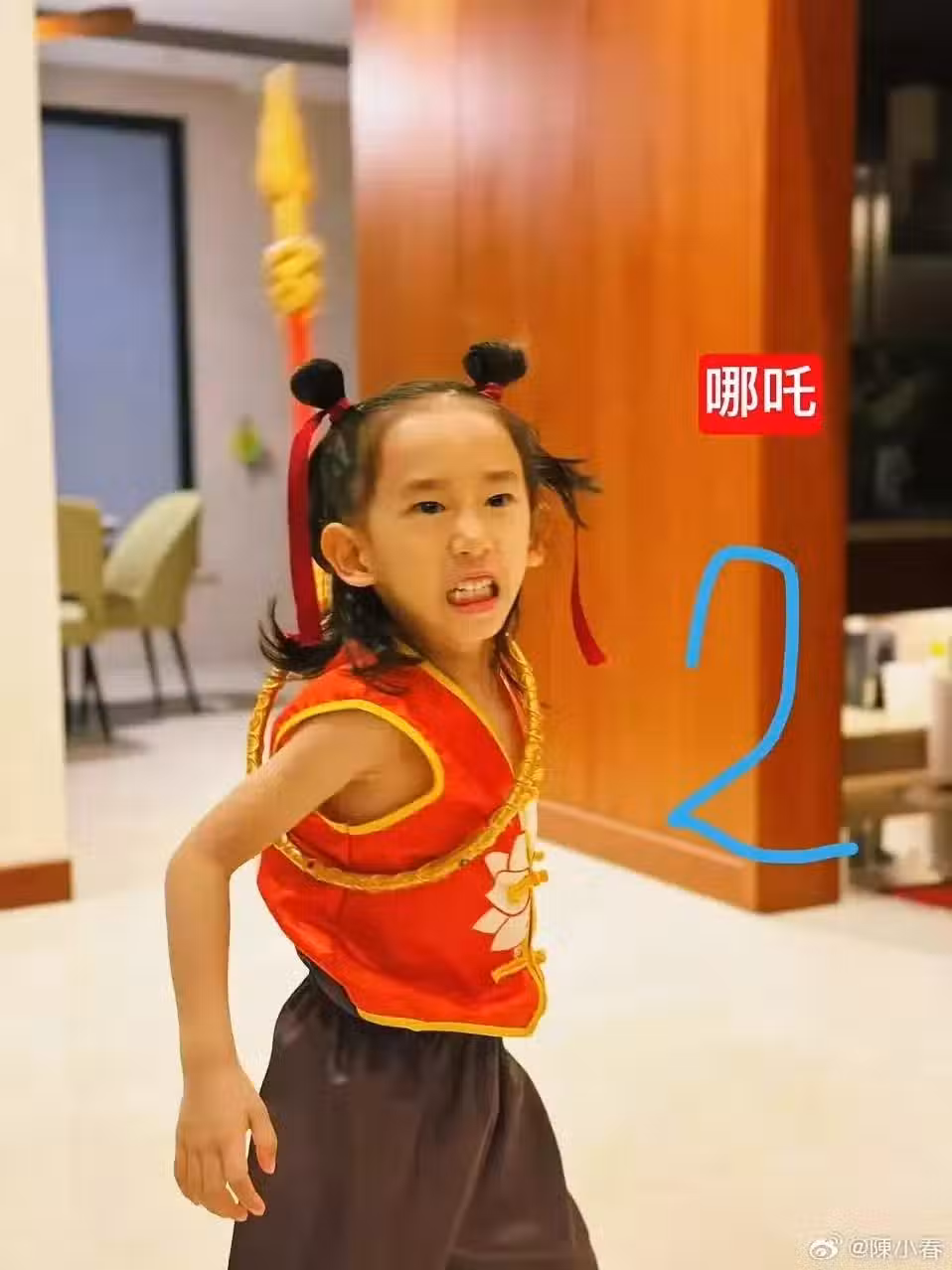 4歲的弟弟hoho的哪吒造型比哥哥還要齊全,身穿整套的紅色馬甲和褲子,頭上用紅色髮帶扎著兩個哪吒頭,身上還掛著一個乾坤圈,妥妥的就是小哪吒一枚呀。關鍵是hoho動作和表情都很到位,生氣齜牙的表情,真的太可愛了。