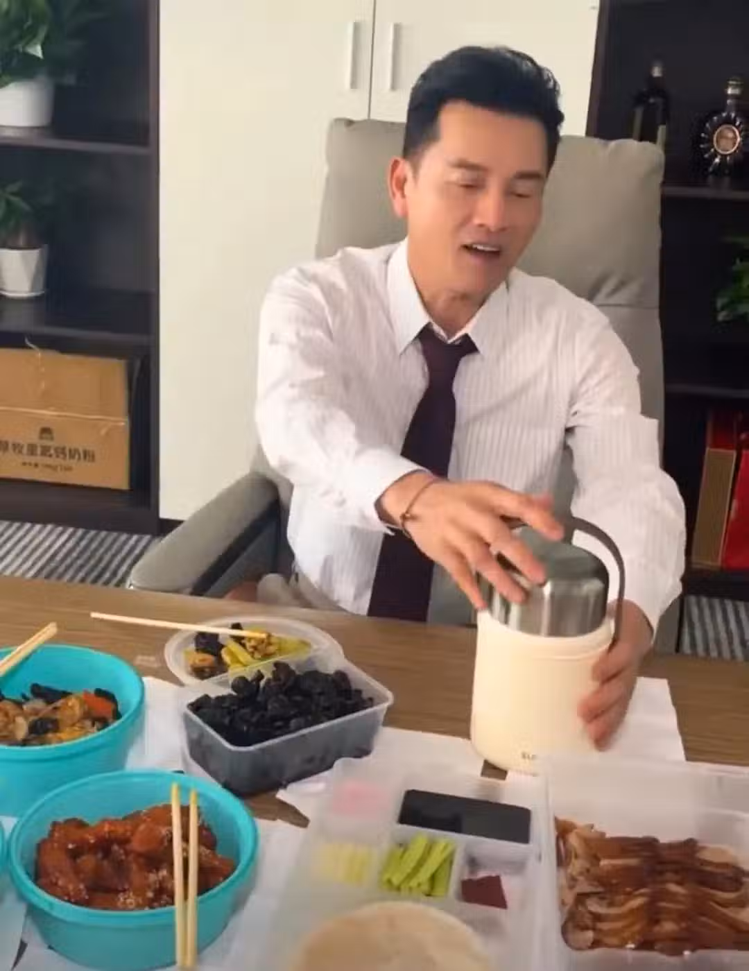 視頻中,70歲的穿著襯衫,打著領帶,一頭烏黑的頭髮,身材保持得非常好,沒有中年發福,臉部皮肉緊緻,狀態非常好!看起來就像50歲。