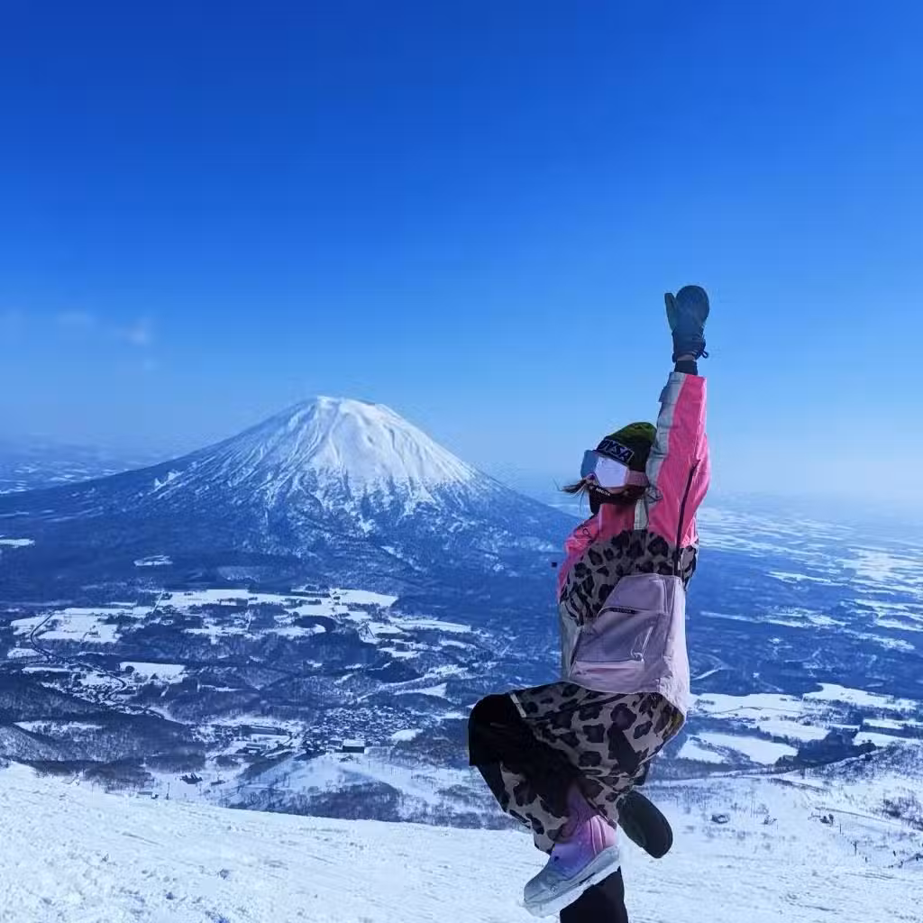 李彩樺身處的是二世古最大的比羅夫滑雪場,她一身粉紅豹紋造型,頭戴墨綠色冷帽、配帶粉紅色LV滑雪眼罩,身穿粉紅色豹紋的滑雪外套及滑雪長褲,腳踩粉紅色的滑雪靴,她舉起單手、曲起單腳興奮地在富士山前打卡。