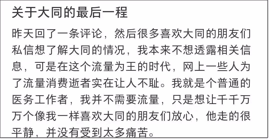 而後,她又特意發布長文聊「關於大同走的最後一程」,稱本不想透露相關信息,但流量為王總有人惡意消費逝者。自身作為一個普通醫務工作者,不需要流量,但想讓成千上萬的粉絲放心,才出來說「方大同走得很平靜,並沒有受到太多的痛苦。」