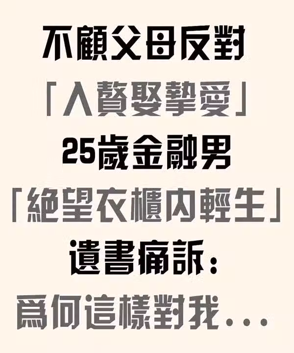 不顧父母反對!25歲金融男「入贅娶摯愛」才半年破滅 絕望「衣櫃內輕.生.亡」遺書痛訴:為何這樣對我...