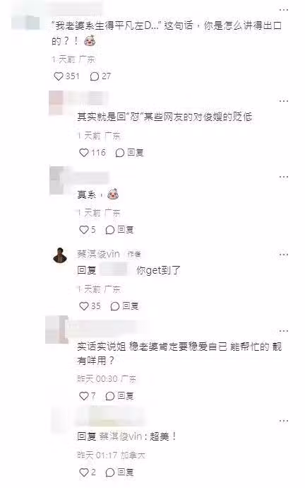 有人則為蔡淇俊辯護:「平凡不是貶低,只是正常人,不是明星一樣耀眼!平凡好好呀!不浮誇、不囂張、好實在。」有人就認為蔡淇俊這樣說,其實就是回應某些網民的對俊嫂的貶低,蔡淇俊見到這則留言非常開心回覆:「你get到了。」