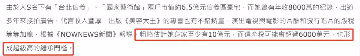 第一,高額遺產稅。台媒分析了一下,如果大S遺產有10億台幣,那遺產稅至少要超過6000萬台幣,所以不是光繼承就行了,還得先出一筆高額遺產稅。