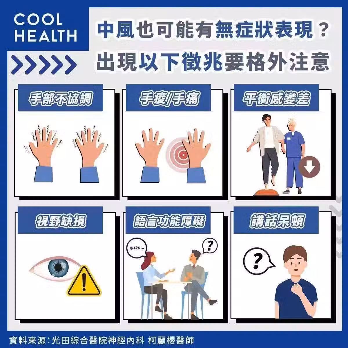 除了這三種反常現象,中風還有其他前兆,同樣不可忽視。例如:突然出現劇烈頭痛、頭暈、噁心、嘔吐,且頭痛、頭暈比往日加重, 或由間斷變成持續性。突然感到一側肢體、臉部、舌頭、嘴唇麻木,同時間同側肢體無力,甚至不能活動。