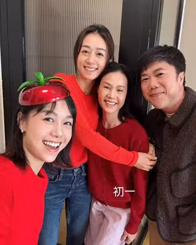 新年期間,泥鯭給岳母拜年,黃心穎全家一起開心合影,50歲的泥鯭不顯老,精心打扮之下狀態滿分。