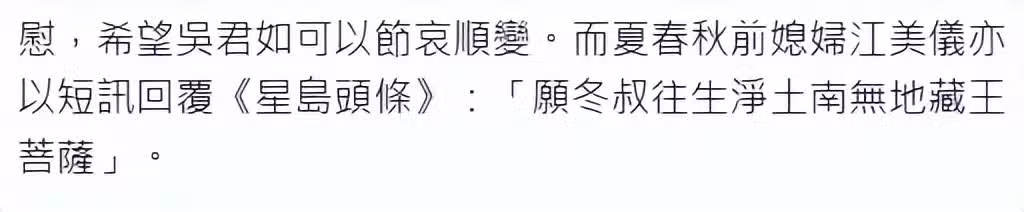 前兒媳婦江美儀第一時間受訪悼念:「願冬叔往生凈土南無地藏王菩薩」-------------------------------------------------------------