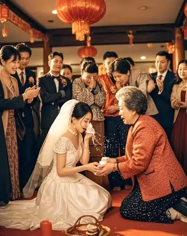 新娘在敬茶時被婆婆潑卸妝水,她當眾擦掉半張臉,全場親戚突然集體下跪