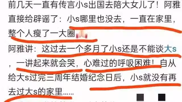 阿雅透露小S自從給姐姐辦完追思會後,就一直呆在家裡沒有出門,也沒有去大S豪宅,整個人瘦了一大圈,特別的憔悴。不敢在她面前提起大S,否則她就會一直流眼淚。