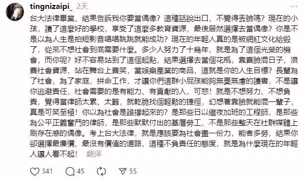 社會需要的是有能力、有貢獻的人,可悲!就是不想努力、不想負責,覺得當律師太累、太難,就乾脆找個輕鬆的捷徑,幻想著靠臉就能混一輩子,真是可笑至極。」