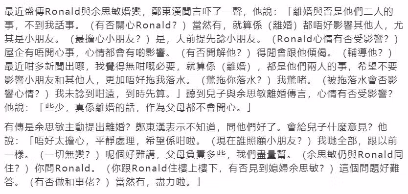 記者提到鄭中基與余思敏的婚變傳聞,鄭東漢沒有承認或者否認,僅表示,「離婚與否是他們二人的事,不到我話事。」