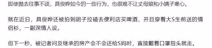 近日網上還有說法稱,具俊曄被媒體拍到鬍子拉碴去便利店買啤酒,對方詢問他繼承的房產會不會給S媽時,沒想到具俊曄直接扭頭就走。