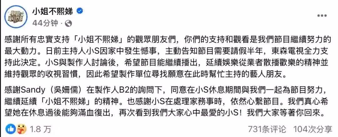 大家一眼就看出消息中的錄製照只是舊圖,但這時間點就很巧妙了,小S事先已經向節目組請了半年的假,但吳姍儒首次接棒便交出了這麼好的成績,而在此之後,有關小S復出的通稿立馬出現,看來小S真的有危機感了哦,不過話已經說出口,就算現在急著回歸恐怕也沒轍。