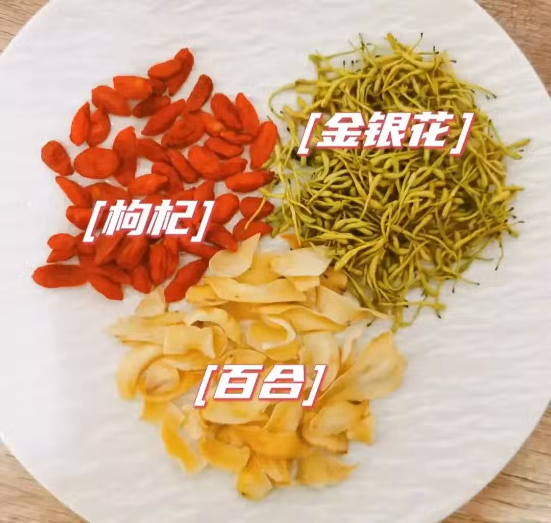 百合10g,金銀花5g枸杞子3g,蜂蜜 ( 過敏者勿加!)