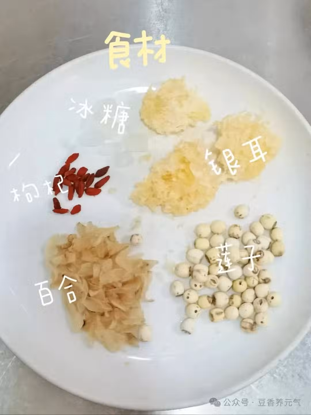 【食材】黃豆20g、蓮子10g、紅皮花生20g、百合10g、一小塊黃冰糖