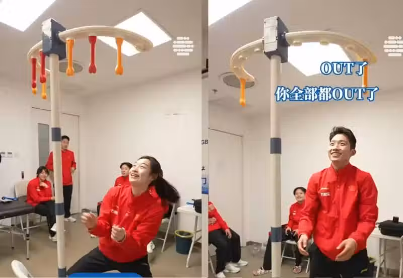 看完整段視頻,就不得不感嘆,全紅嬋的反應能力真的太敏捷,太強了,不急不慌,每一個都接到恰到好處,而且接到的棒子一直都在手上,其他隊員都是接一個扔一個,手忙腳亂,甚至有幾個用力過猛,差點把架子都推倒了。